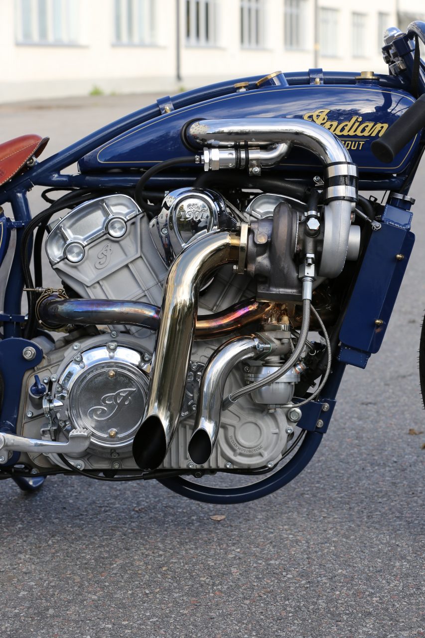 The engine, fuel pump, headlamp and shifter pedal are from a modern day Scout, but the frame is a one-off built from three sections. Lasse Sundberg (from Roth Engineering) built the frame up in-house and says it was the most difficult part of the build, surprisingly even more tricky than the fitting the turbo.