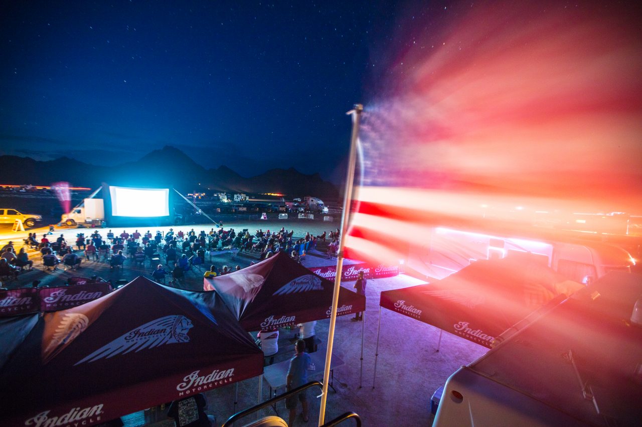 America’s first motorcycle company capped off the weekend with something that had never been done before – a moonlit screening of “The World’s Fastest Indian” under the desert sky for the Bonneville Speed Week campers.
