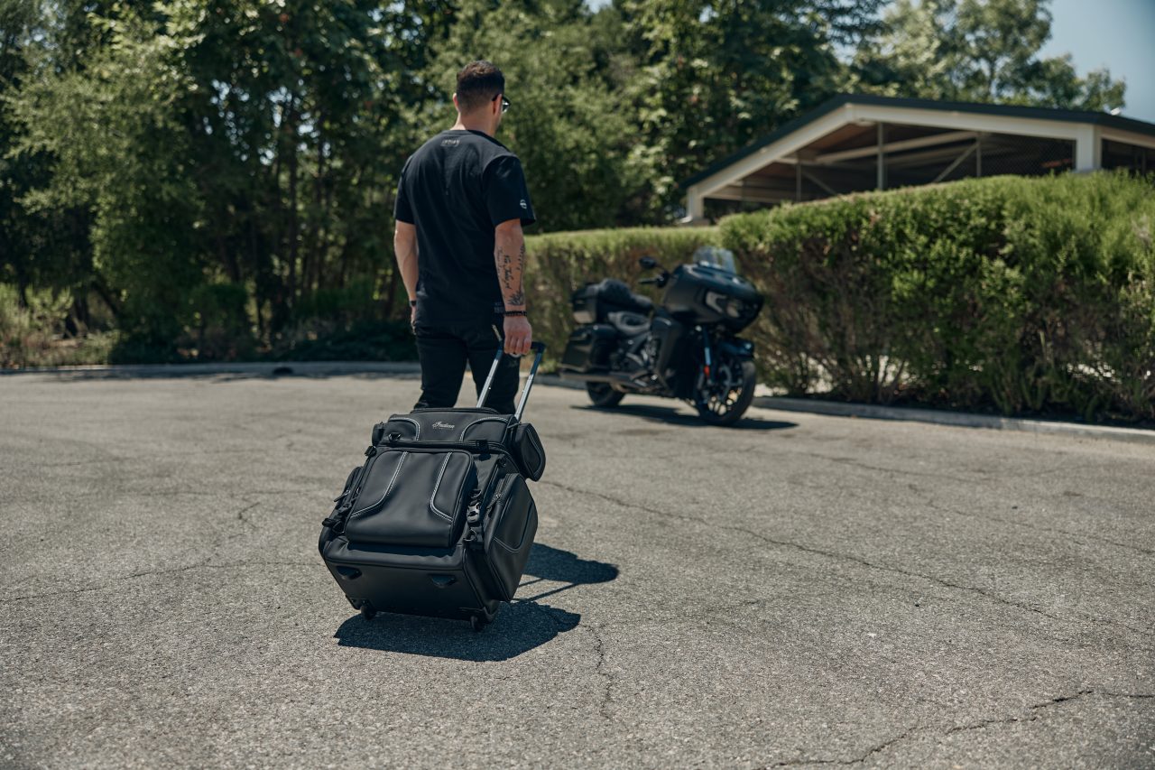 - Spirit Lake Wheeled Touring Bag: The Spirit Lake Wheeled Touring Bag blends premium craftsmanship with everyday convenience. Integrated wheels and a telescoping handle make it easy for riders to transport gear. Spacious, stylish, and road-trip-ready, it’s an ideal companion for extended adventures. Riders can pack at home, wheel the bag to the bike, attach it to a sissy bar or passenger backrest, and hit the road – no repacking required.