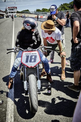 After comfortably winning against Dragger, Katja’s second race was against Mathie Menard on a Triumph Street Twin built by FCR Original and called ‘Alienor’.