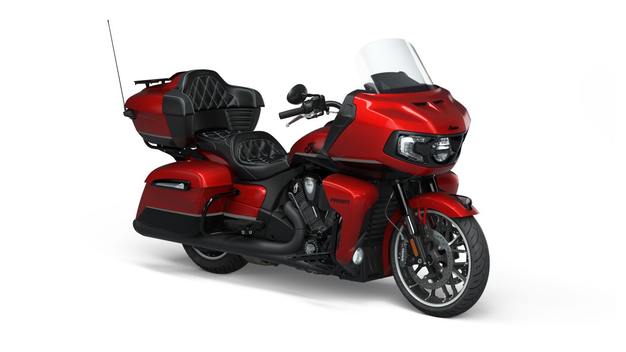 The chassis-mounted fairing provides for lighter steering and is less affected by the wind. The adjustable windscreen and vented lower fairings provide superior protection from the elements and a heightened level of flexibility to adjust to varying weather and temperature conditions. Premium style integrated driving lights in the lower fairings improve visibility at night and in colder weather, heated grips keep riders’ hands warm while the Pursuit’s new Heated Touring Comfort seat delivers unprecedented comfort. In addition, a premium cargo trunk and spacious saddlebags combine for more than 133 litres of power-locking storage.