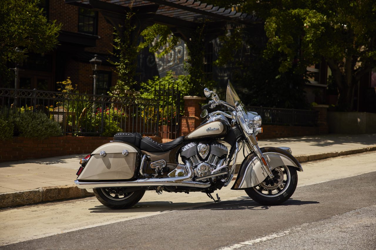 Pure and classic styling define the Indian Springfield. Standard with ride modes and rear cylinder deactivation, the Indian Springfield maintains rider-favourite features such as the quick release windshield, genuine leather seats, remote-locking saddlebags and adjustable passenger floorboards.