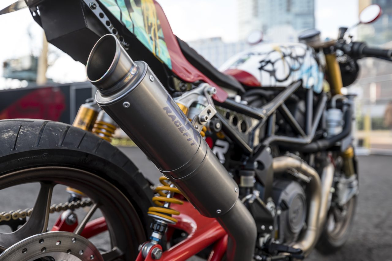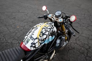The high spec parts continue with Gilles reasets, clip-on handlebars, Domino grips and a titanium Racefit “Longhorn” Growler exhaust.